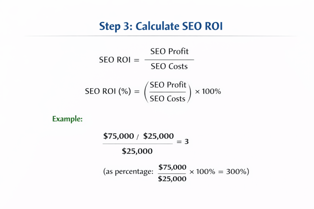Formula for SEO ROI (ratio or percentage)= SEO profit divided by SEO costs multiplied by 100.